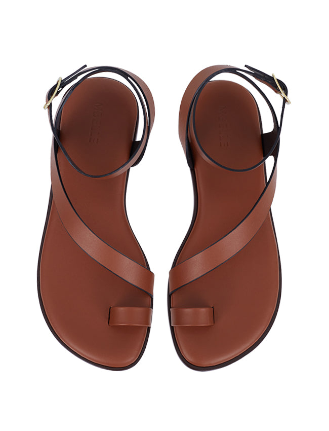 Sua tira em formato orgânico desenha o peito pé e contrasta com o visual rústico do couro cortado a fio.