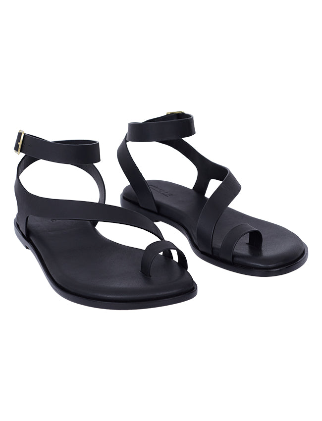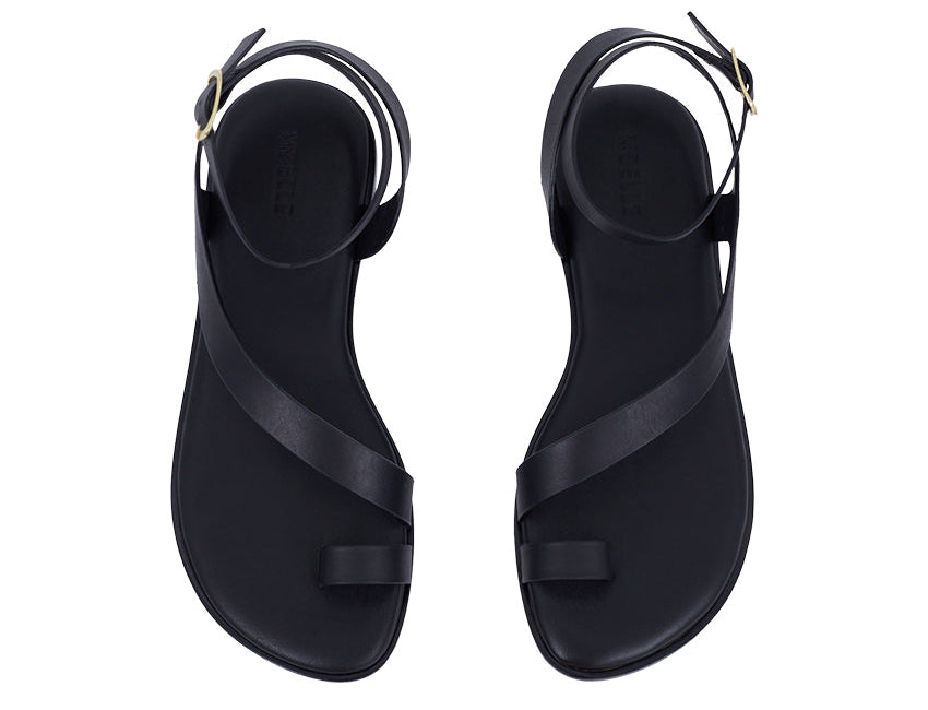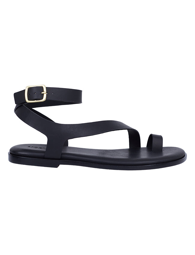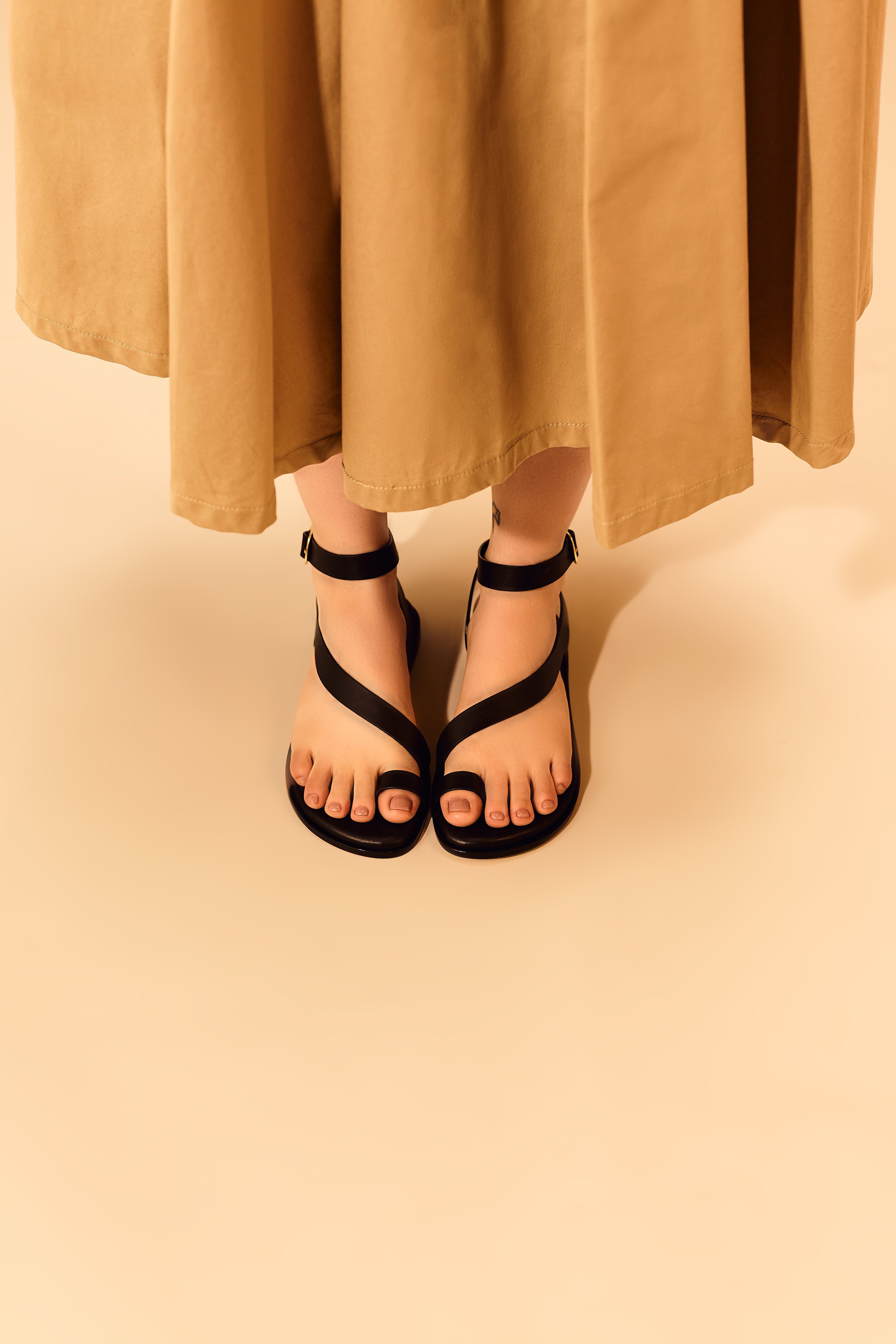 Sua tira em formato orgânico desenha o peito pé e contrasta com o visual rústico do couro cortado a fio.