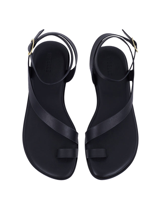 Sua tira em formato orgânico desenha o peito pé e contrasta com o visual rústico do couro cortado a fio.